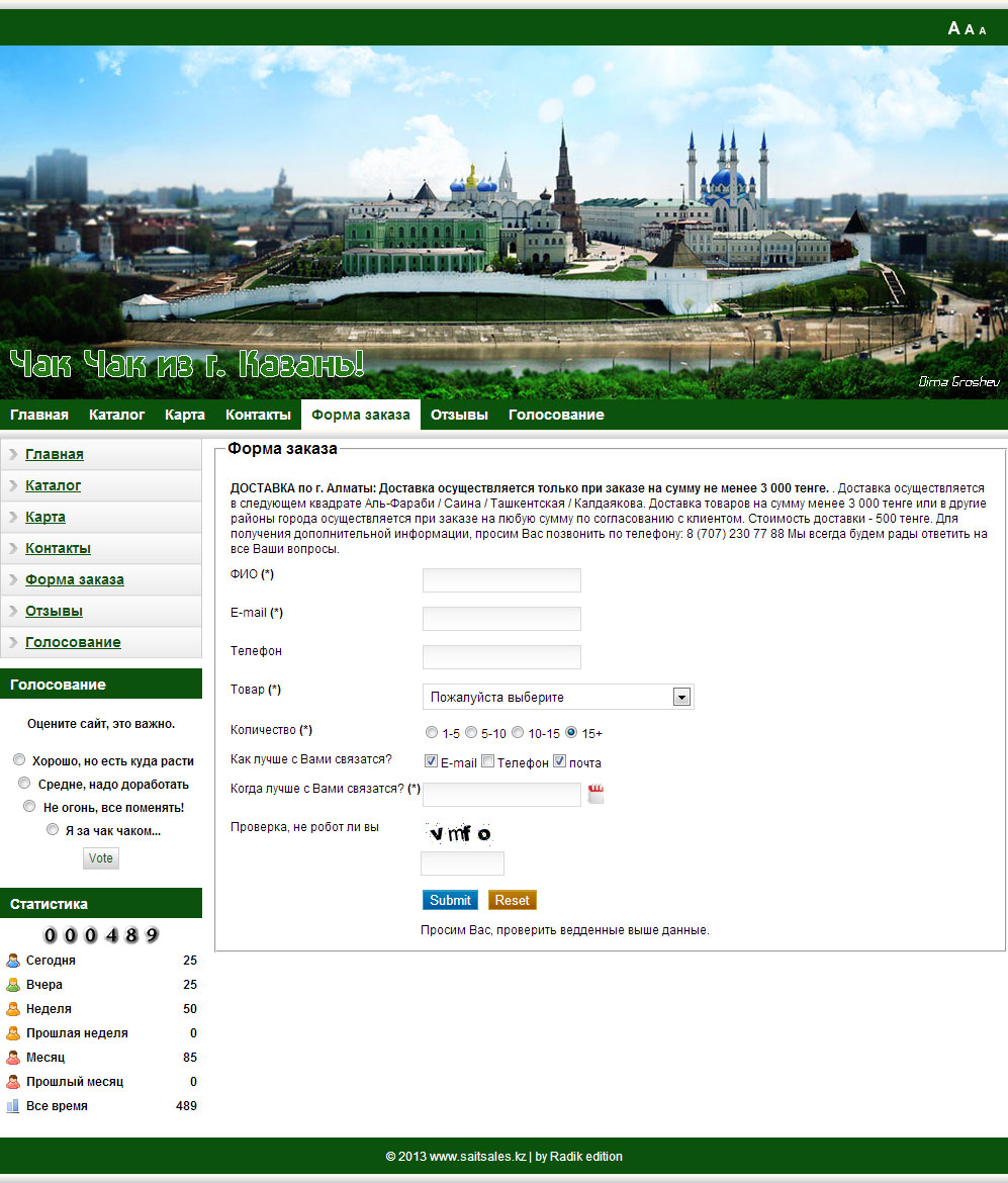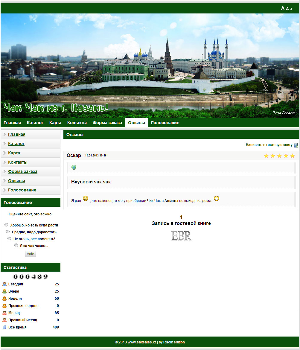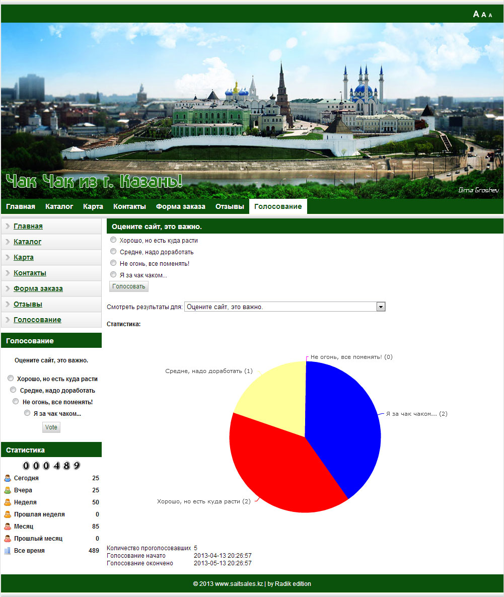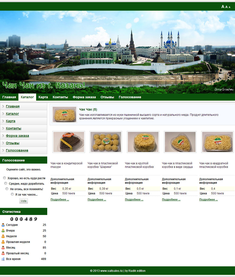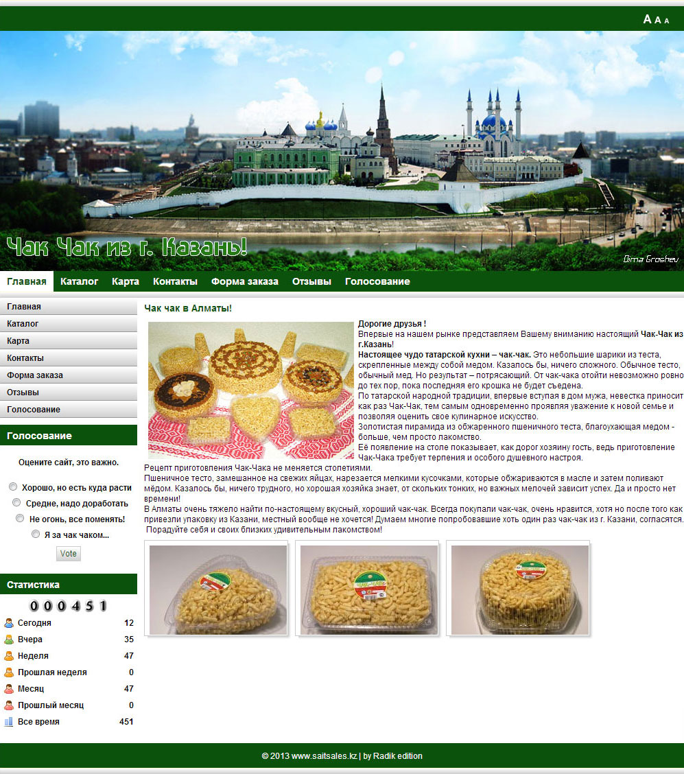 Time for development - month Implemented by: design Catalog of goods, with photos and additional information electronic order form Guest book vote attendance statistics Map of Yandex Ajax loading pages (without restarting the site)